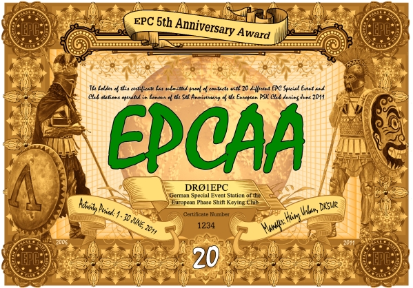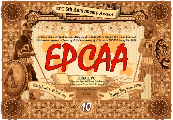Damit wurde eine Serie von Diplomen geschaffen, für die Kontakte mit verschiedenen EPC Sonderstationen und EPC Clubstationen nachgewiesen werden müssen, die als Auszeichnung für den 5. Jahrestag des Europäischen PSK Clubs, im Zeitraum vom 1. bis zum 30. Juni 2011, aktiv sind.