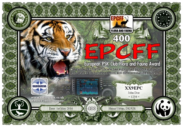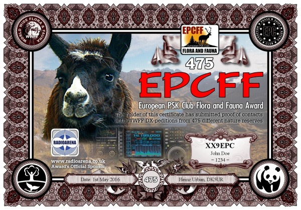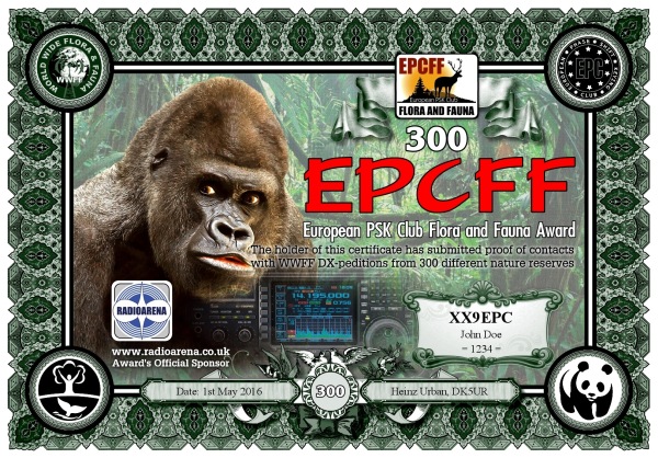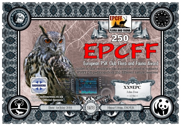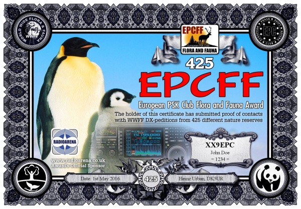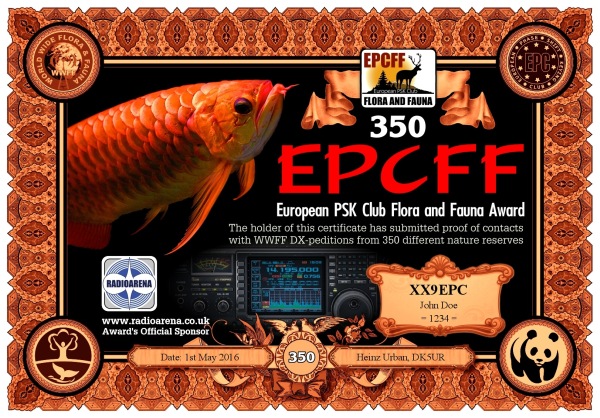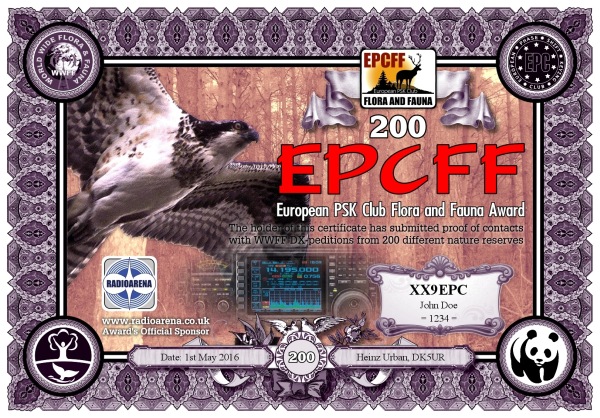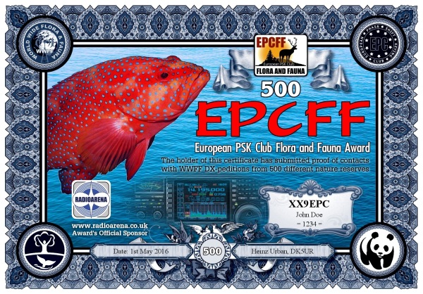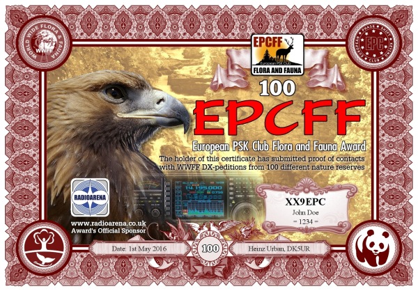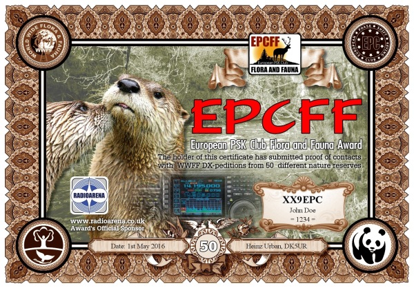 The EPC Flora and Fauna (EPCFF) award is dedicated to the 10th Anniversary of the European PSK Club. It has been sponsored by Radioarena UK Ltd and devised by the European PSK Club on 1st May, 2016 for two-way PSK contacts with various so-called WWFF nature protected entities World Wide listed at WWFF website. Contacted WWFF expeditions (stations) don't need to be members of the European PSK Club. This award series has no time or date restrictions.