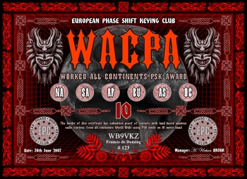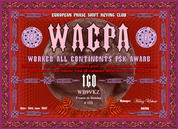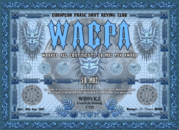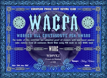 Die Worked all Continents PSK Diplomserie wird an YL's und OM's verliehen, die Kontakt mit allen sechs Kontinenten in PSK nachweisen können. Für dieses Diplom zählen Afirka, Asien, Europa, Nordamerika, Ozeanien (mit Australien) und Südamerika.