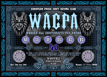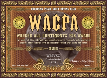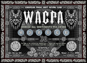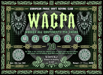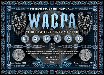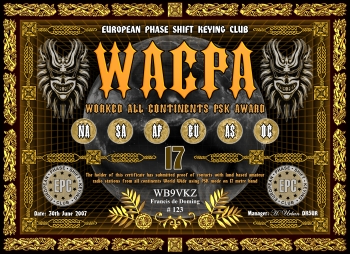 Das Grunddiplom wird für Kontakte mit allen sechs Kontinenten, egal auf welchem Band (160-6m), verliehen. Es gibt desweiteren das klassische 5-Band Diplom (80m-40m-20m-15m-10m) und ein WARC Diplom (30m-17m-12m), sowie Monoband Diplome von 160m bis 6m. Es gelten alle Kontakte ab dem 01.01.2000. Der Antragsteller muß EPC Mitglied sein.