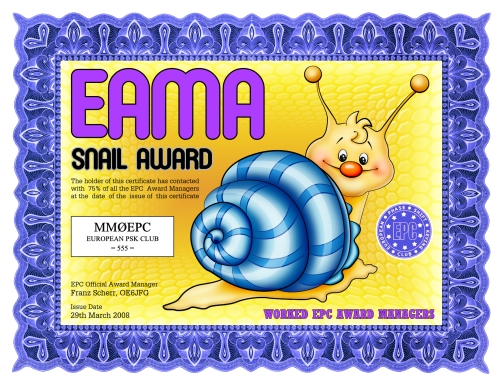Zur Zeit sind vier Stufen verfügbar. Das EAMA-Ant wird für Kontakte mit 25% aller Diplom Manager, das EAMA-Bee für 50% aller Diplom Manager, das EAMA-Snail für 75% aller Diplom Manager und das EAMA-Hedgehog für Kontakte mit allen Diplom Manager erteilt.