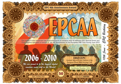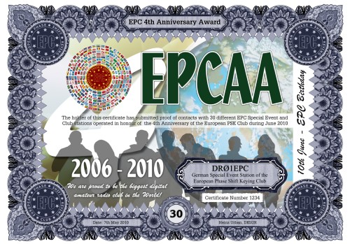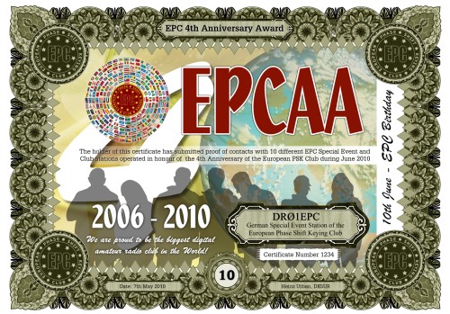 Damit wurde eine Serie von Diplomen geschaffen, für die Kontakte mit verschiedenen EPC Sonderstationen und EPC Clubstationen nachgewiesen werden müssen, die als Auszeichnung für den 4. Jahrestag des Europäischen PSK Clubs, im Zeitraum vom 1. bis zum 30. Juni 2010, aktiv sind.