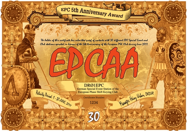 Damit wurde eine Serie von Diplomen geschaffen, für die Kontakte mit verschiedenen EPC Sonderstationen und EPC Clubstationen nachgewiesen werden müssen, die als Auszeichnung für den 5. Jahrestag des Europäischen PSK Clubs, im Zeitraum vom 1. bis zum 30. Juni 2011, aktiv sind.
