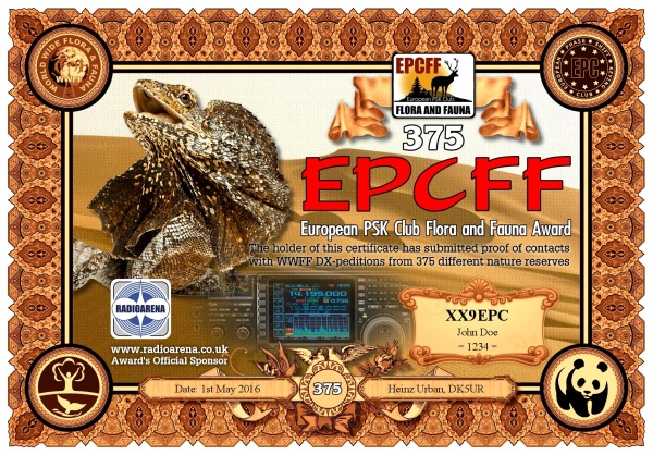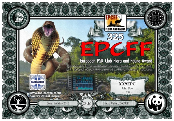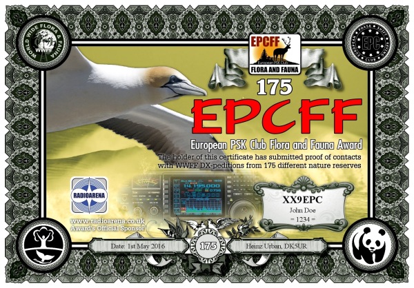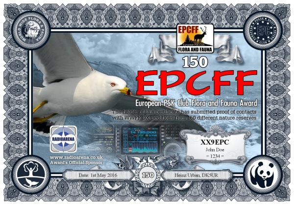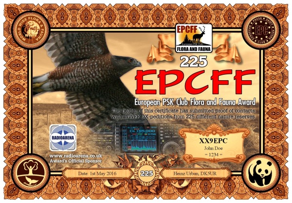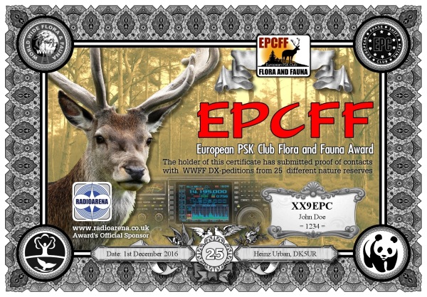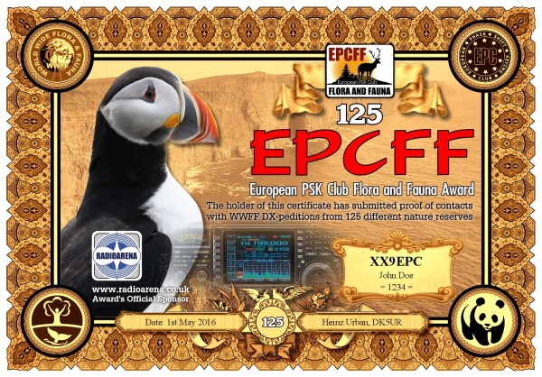 The EPC Flora and Fauna (EPCFF) award is dedicated to the 10th Anniversary of the European PSK Club. It has been sponsored by Radioarena UK Ltd and devised by the European PSK Club on 1st May, 2016 for two-way PSK contacts with various so-called WWFF nature protected entities World Wide listed at WWFF website. Contacted WWFF expeditions (stations) don't need to be members of the European PSK Club. This award series has no time or date restrictions.