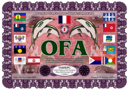 Die Französische Überseeterritorien PSK Diplomserie (OFA) wurde vom Europäischen PSK Club (EPC) am 10. Februar 2009 gestiftet. Die Diplomserie wurde geschaffen, um Kontakte mit Amateurfunkstationen, in den Französischen Übersee-Departements und Territorien, zu fördern. Die Französischen Übersee-Departements und Territorien beinhalten Inselgebiete im Atlantik, Pazifik und Stillen Ozean, sowie Territorien der südamerikanischen Küste und Gebiete in der Antarktis.