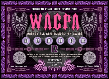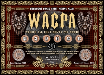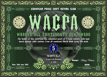 Das Grunddiplom wird für Kontakte mit allen sechs Kontinenten, egal auf welchem Band (160-6m), verliehen. Es gibt desweiteren das klassische 5-Band Diplom (80m-40m-20m-15m-10m) und ein WARC Diplom (30m-17m-12m), sowie Monoband Diplome von 160m bis 6m. Es gelten alle Kontakte ab dem 01.01.2000. Der Antragsteller muß EPC Mitglied sein.