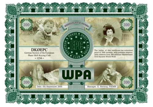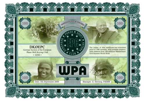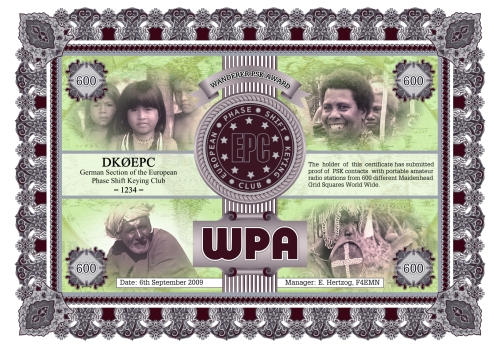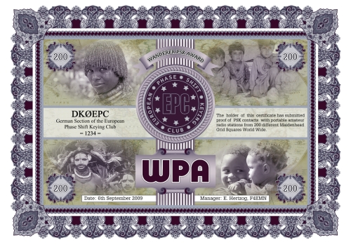 Das WPA 100, WPA 200, WPA 300, WPA 400, WPA 500 und WPA 600 Diplom kann von jedem lizensierten Funkamateur, jeder Klubstation und jedem SWL nach diesen Regeln beantragt werden, wenn nachgewiesen werden kann, dass portable- oder mobil-Stationen aus 100, 200, 300, 400, 500 oder 600 unterschiedlichen Locatorfeldern in den PSK-Modi (B(Q)PSK31, B(Q)PSK63 oder B(Q)PSK125) gearbeitet bzw. gehört wurden. Es zählen nur Verbindungen auf Kurzwelle (1,8 - 30 MHz). Dieselbe portable oder mobile Station ist gültig, wenn sie aus unterschiedlichen Locatorfeldern aktiv ist. Jede gearbeitete/ gehörte Station muss einen portable- oder mobil-Zusatz am Rufzeichen vorweisen, wie z.B. /p, /m, /1...0, usw.. Allgemein wird unter portable-Stationen eine Station außerhalb des Heimat-QTHs verstanden. Wenn es machbar ist, wird eine Liste von speziellen portable-Aktivitäten von Stationen ohne eindeutige Identifikation (wie z.B. MS0DGR, MS0EPC,..) veröffentlicht. Maritime mobile Stationen ( /mm) sind nicht gültig für diese Diplomserie. Alle Verbindungen müssen nach dem 10. Juni 2006 getätigt worden sein.